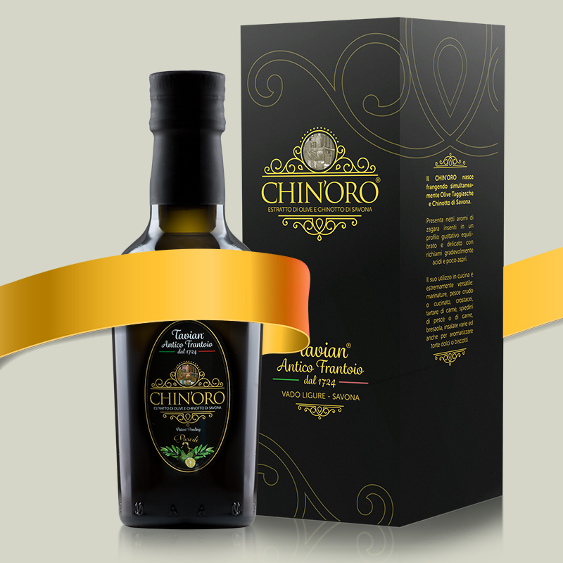 Il CHIN’ORO è frutto di una lavorazione unica. Olive Taggiasche accuratamente selezionate e Chinotto di Savona Presidio Slow Food vengono macinati e lavorati simultaneamente! Prende così vita un “olio aromatizzato” dalle caratteristiche sorprendenti.
