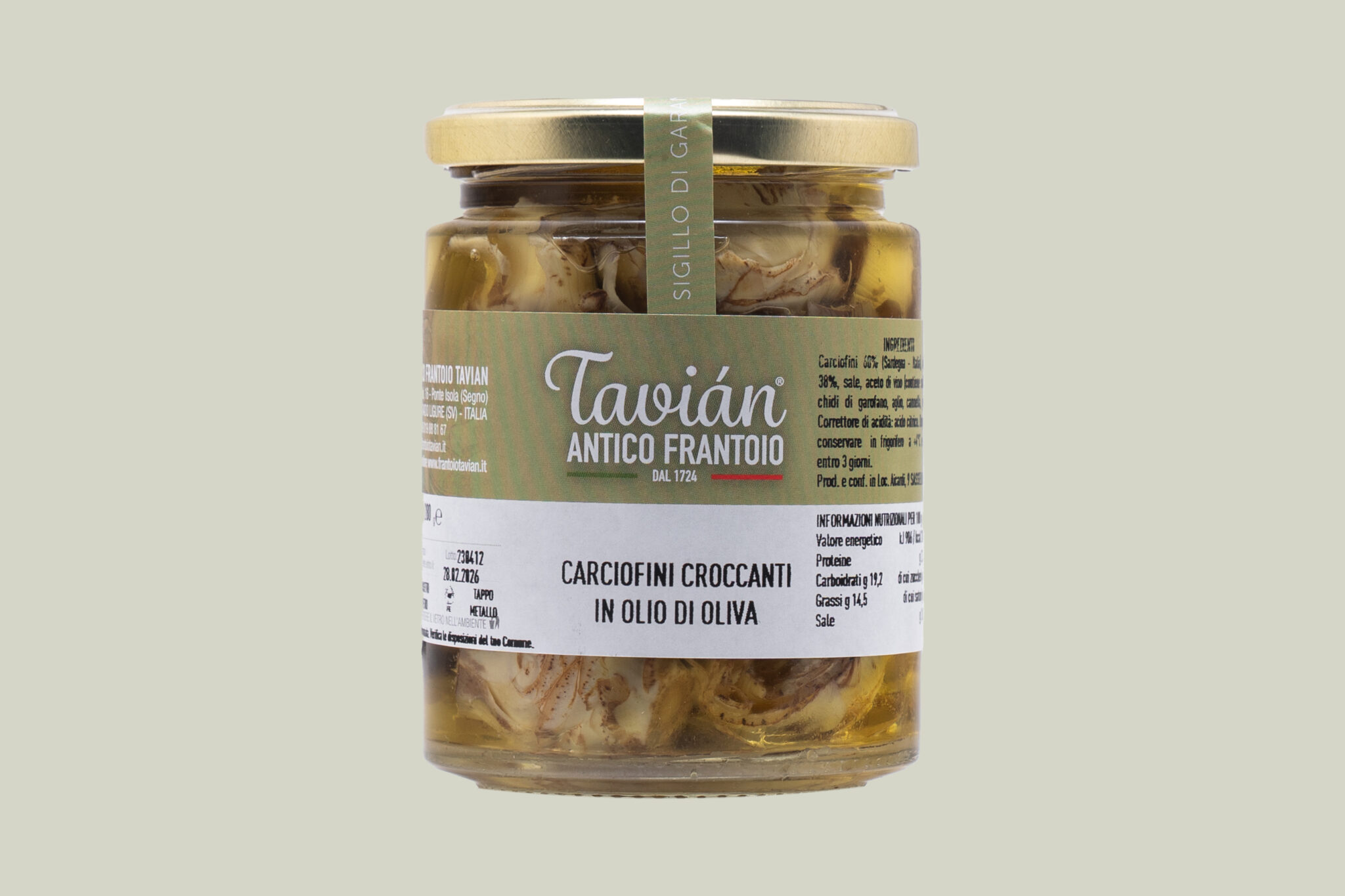 Croccanti cuori di carciofo interi, lavorati e poi conservati in olio d’oliva. Sono indicati come antipasto o come contorno a carne e pesce. Carciofini 60% (Sardegna – Italia), olio di oliva 38%, sale, aceto di vino (contiene solfiti), alloro, chiodi di garofano, aglio, cannella, peperoncino. Correttore di acidità: acido citrico.